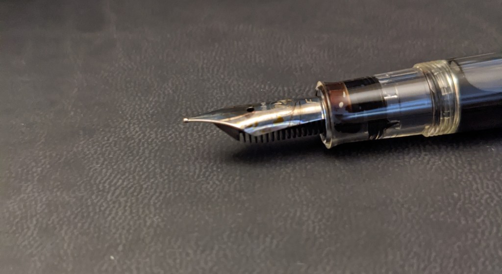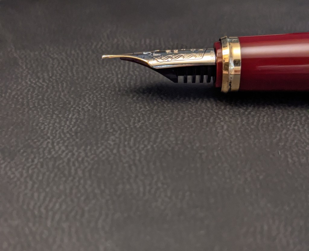 The photo above is a sample of both my girlfriend and I trying out some currently inked pens while reverse writing. Gold nibs ended up working well across the board, while steel nibs ended up being more finicky. The Pelikan m200 and MontBlanc Monte Rosa are both steel nibs that performed very well reversed. The m200 is normally quite broad for a fine nib, and with Noodler’s Golden Brown it’s extra wet. Reversed though, the nib is more akin to a Japanese fine. In the photo below I tried to get a close-up of the Pelikan nib. The tip is pretty ball shaped, with some raised tipping material on top. Theoretically, any nib with raised tipping material like that should work for reverse writing.