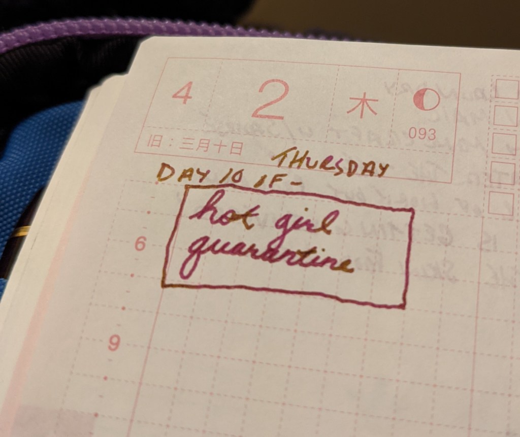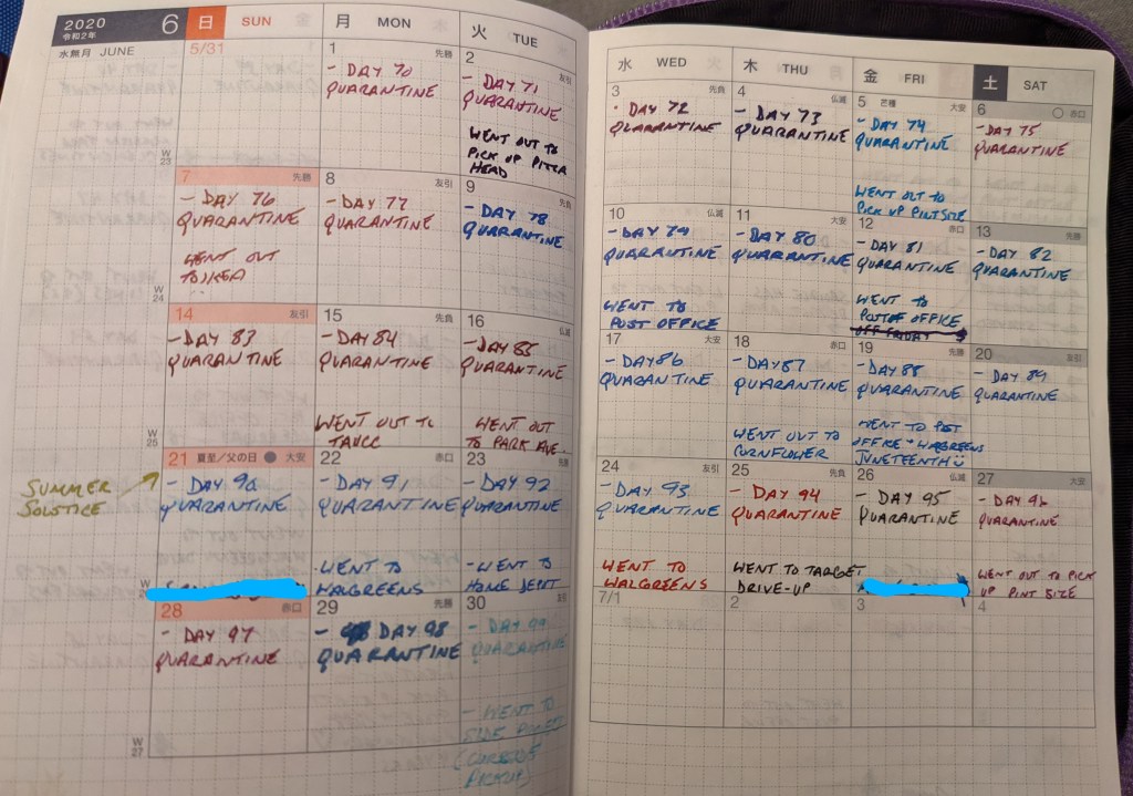 For the daily pages, the Hobonichi has a very nice layout. In the top left corner there’s the date and weekday as well as any applicable holidays. In the top right corner there’s a little area with five checkboxes for a to-do list. The rest of the page is gridded with subtle lines that are different colors for each month. At the bottom of the page there is a daily quote. Since my version is in Japanese, I ended up handwriting the day of the week and applicable holiday. I also wrote down what number day of my lockdown it was; the last day I logged was number 281. By the middle of the year it’s gonna be like Blast From The Past when Brendan Fraser’s character first leaves the bunker.
