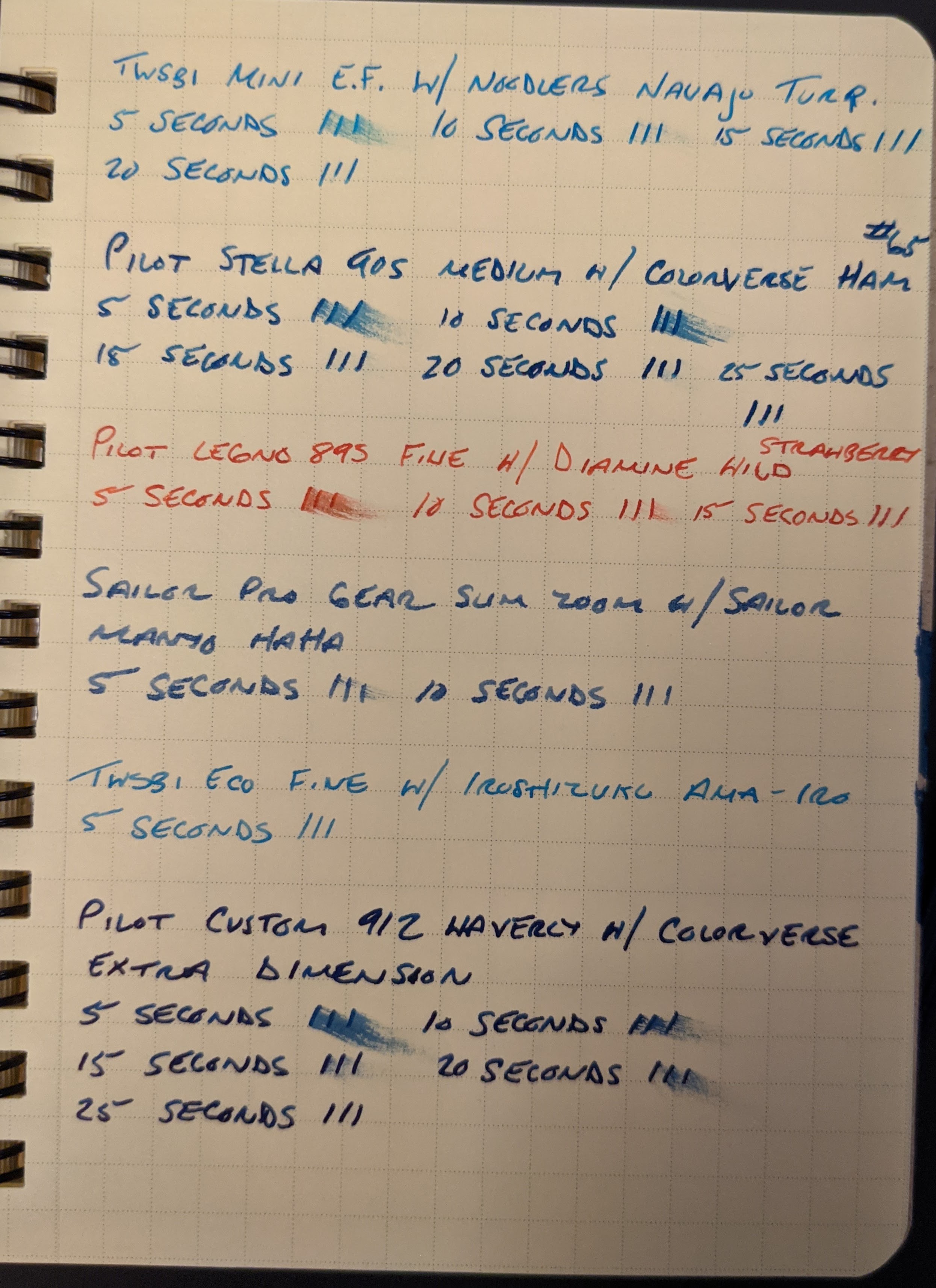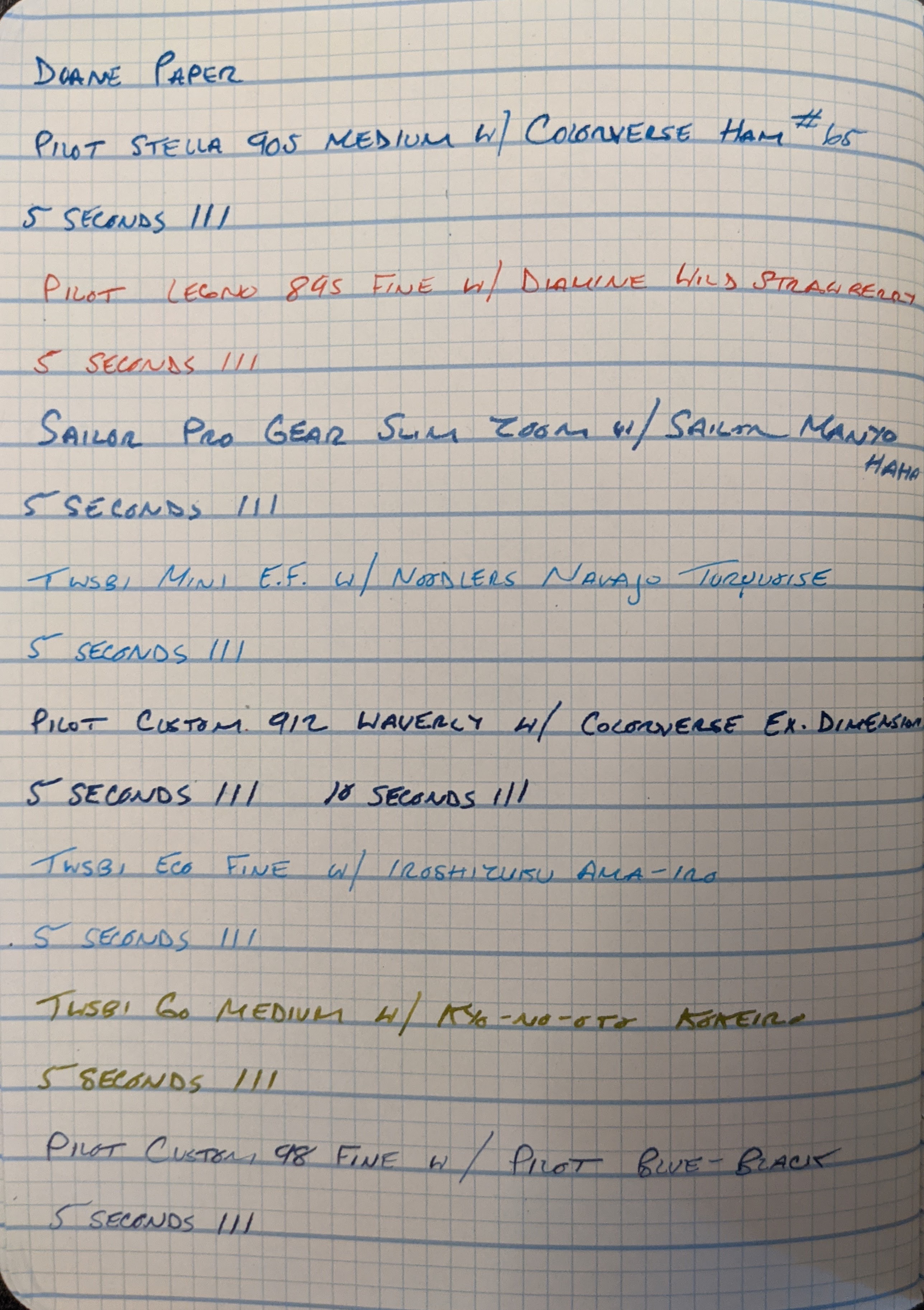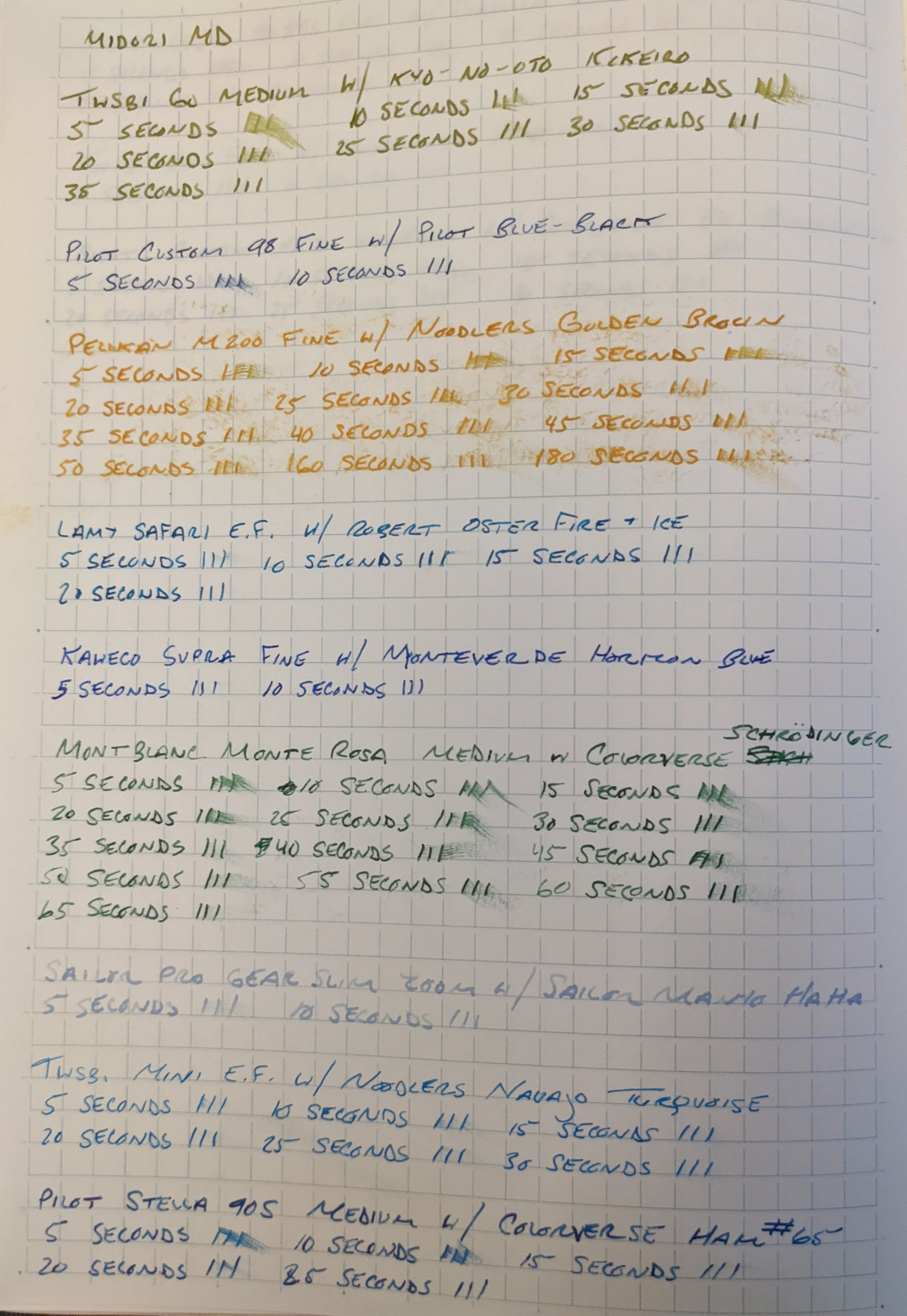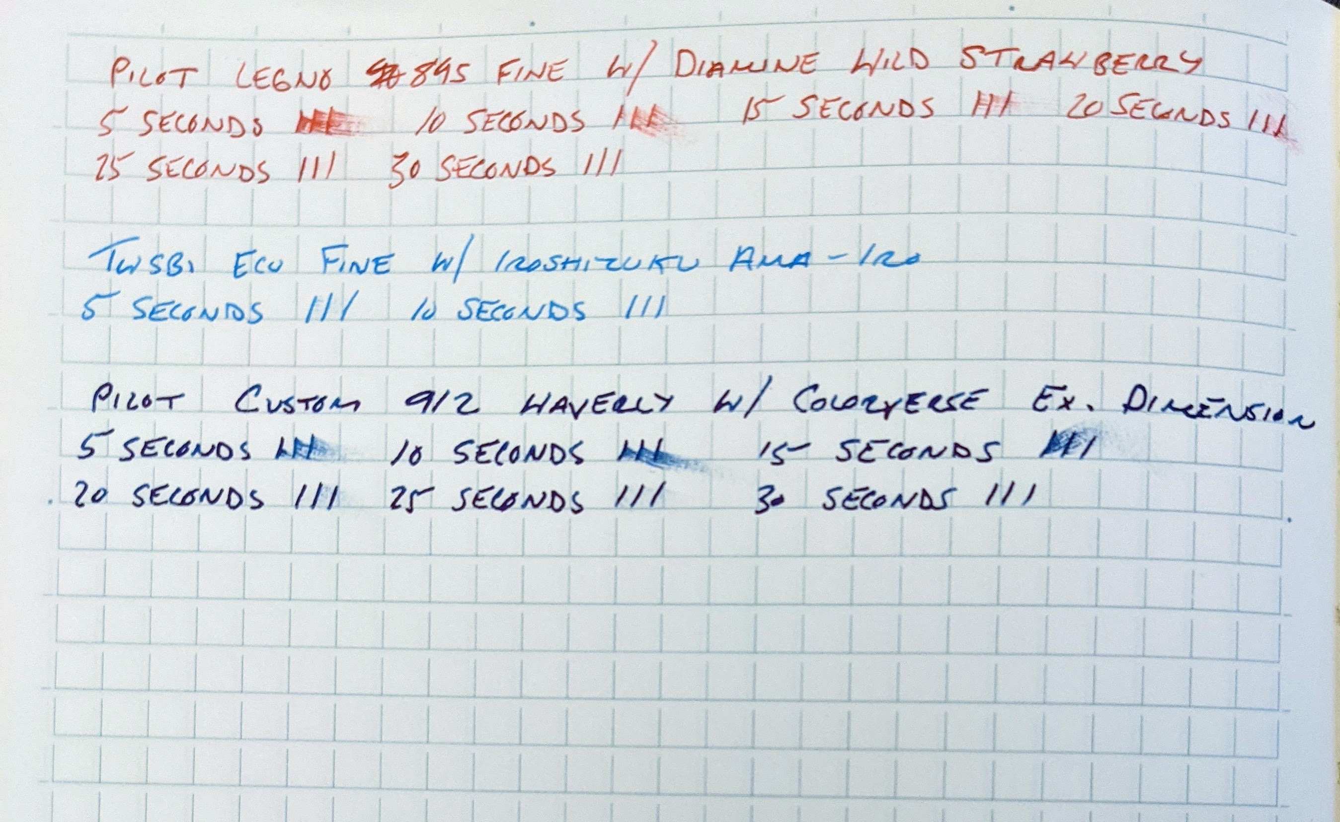 This is part two of a series of scientific paper tests to determine the most lefty and fountain pen friendly paper. To read Part One, please click here. I tested each paper with 12 pens with inks of varying degrees of wetness. Dry-times were measured by dragging my finger across three lines after 5 seconds, and then repeating this process with new lines until the ink dried, increasing each time by 5 seconds.