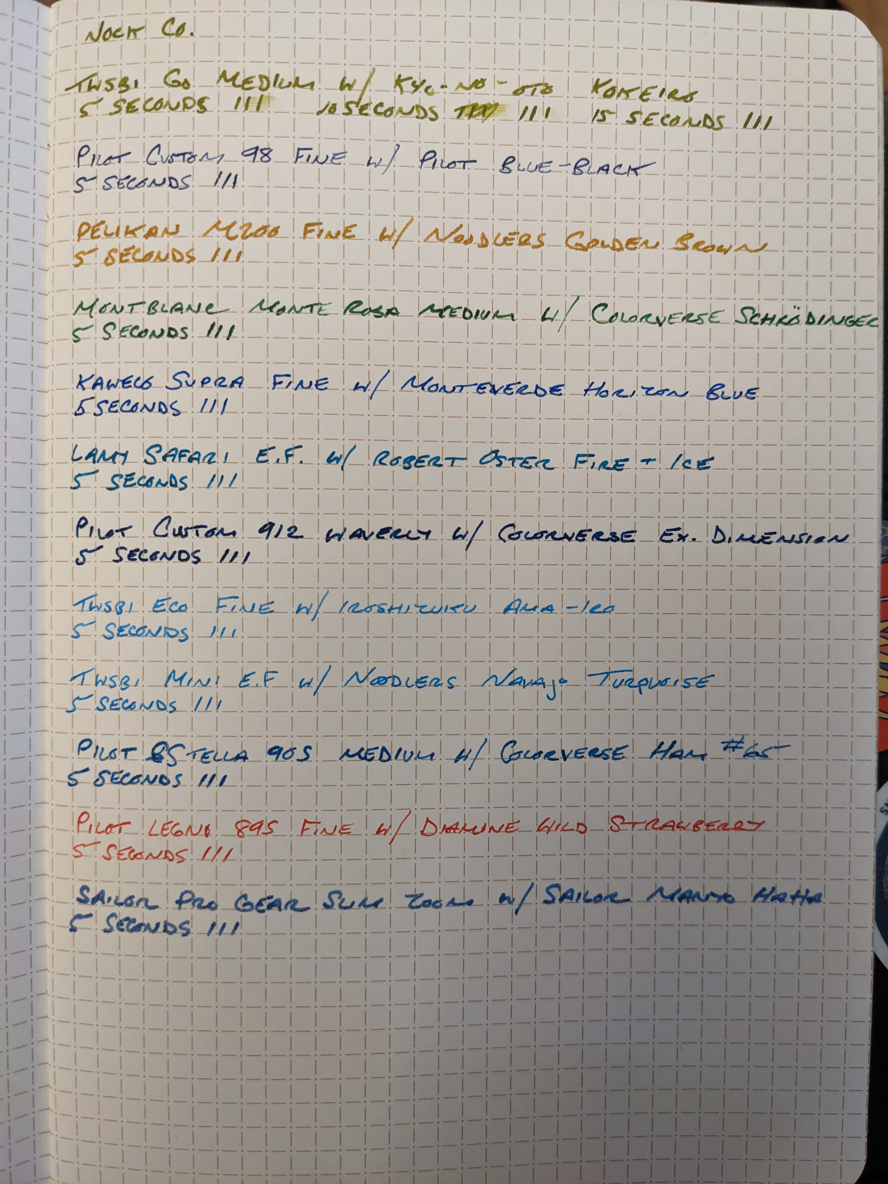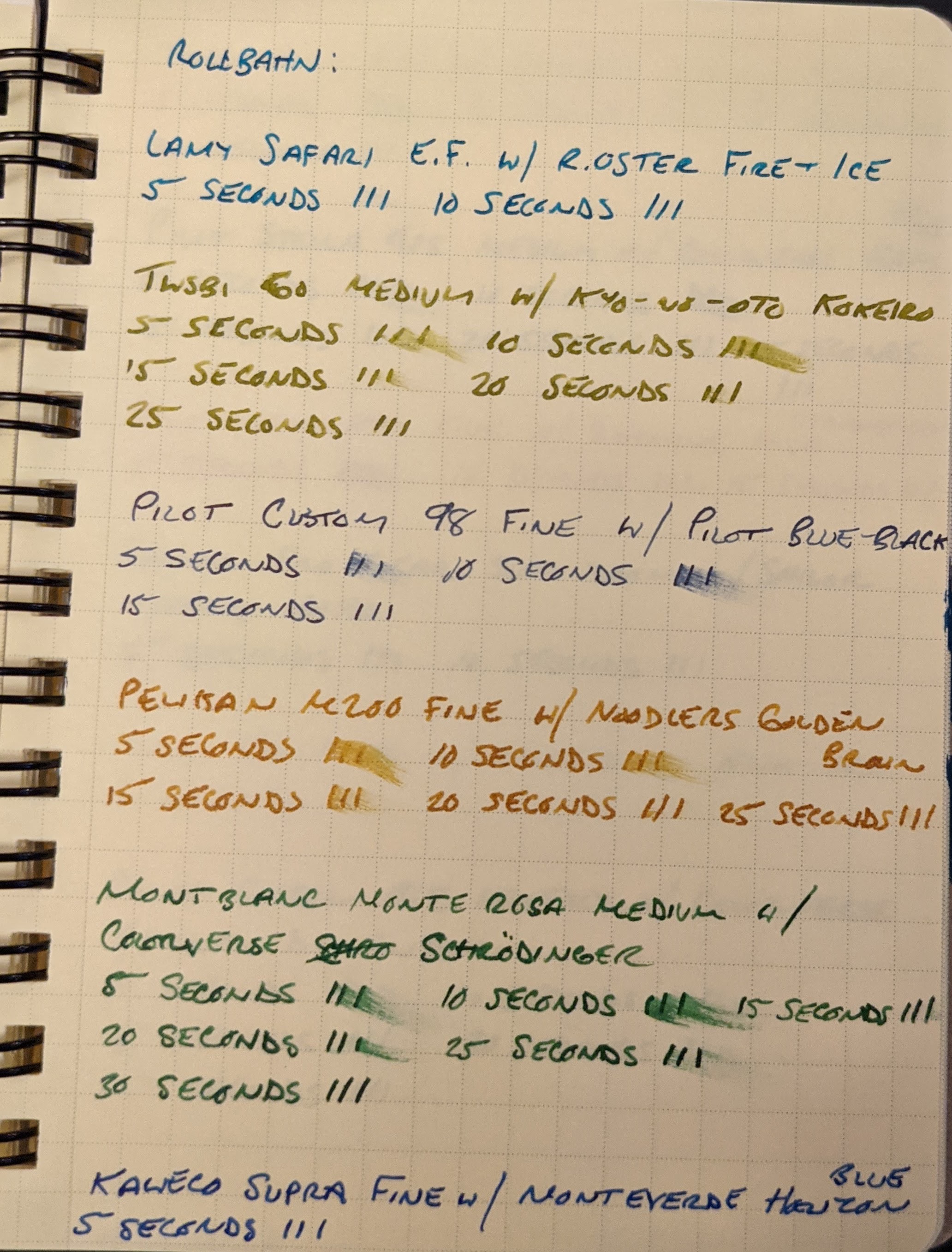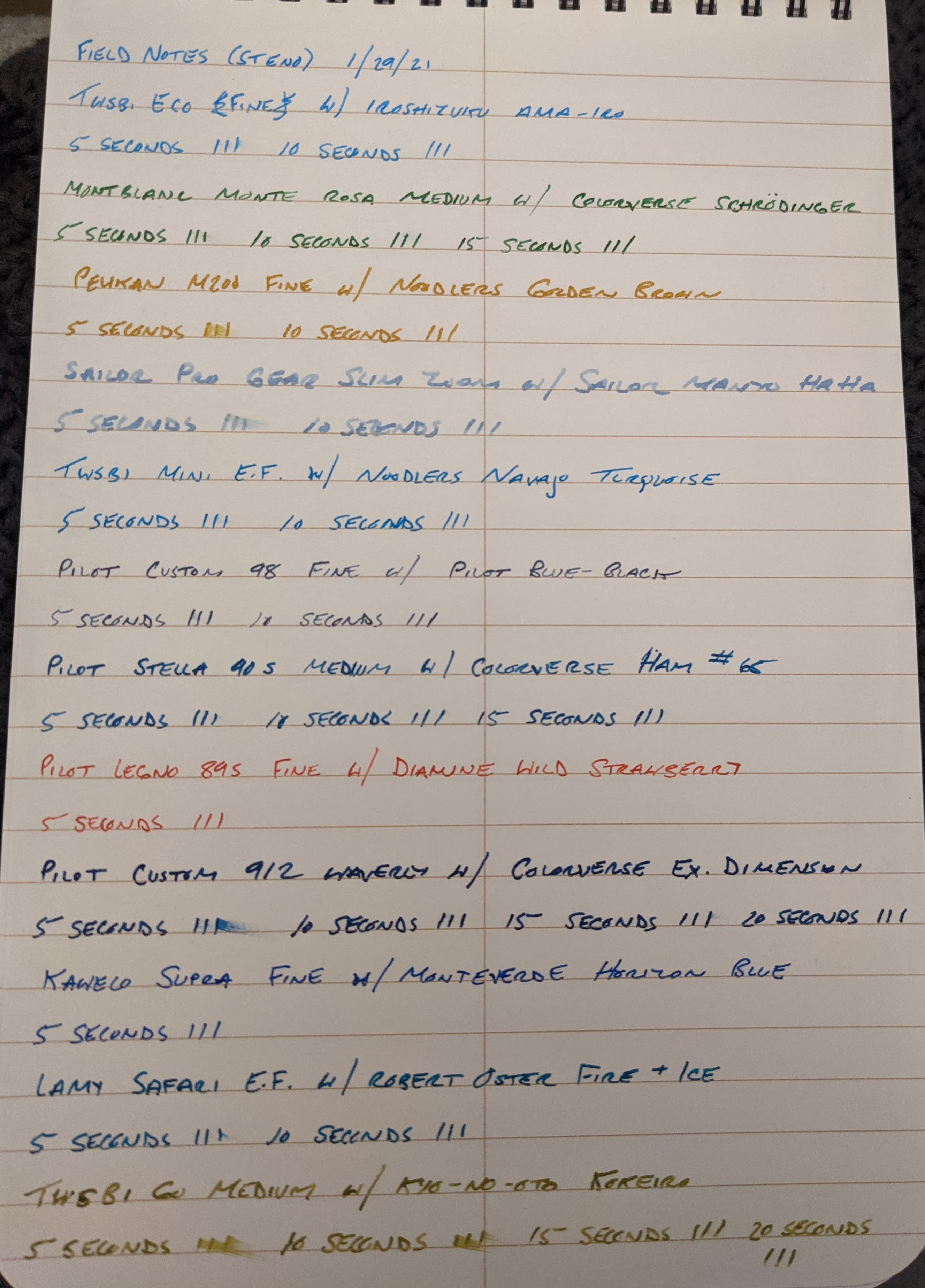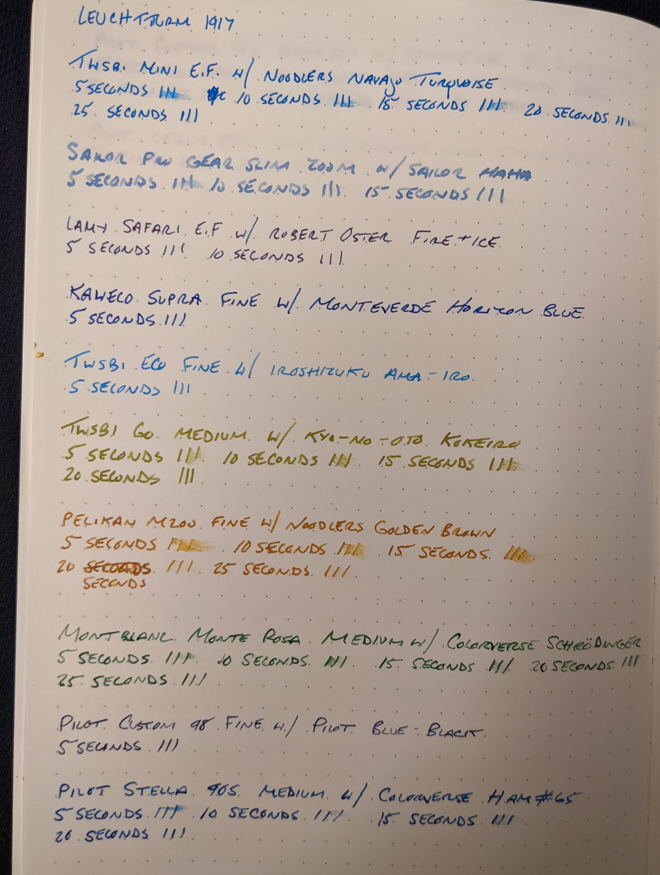 This is part two of a series of scientific paper tests to determine the most lefty and fountain pen friendly paper. To read Part One, please click here. I tested each paper with 12 pens with inks of varying degrees of wetness. Dry-times were measured by dragging my finger across three lines after 5 seconds, and then repeating this process with new lines until the ink dried, increasing each time by 5 seconds.