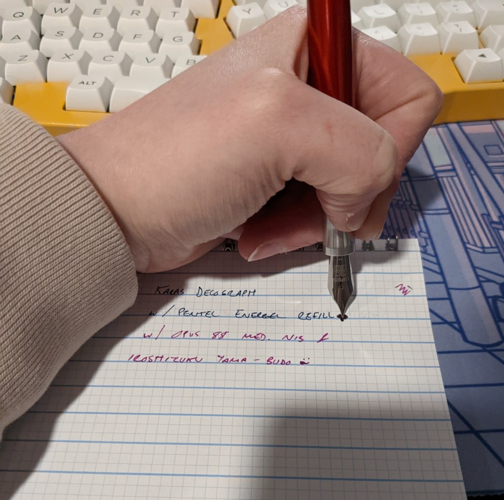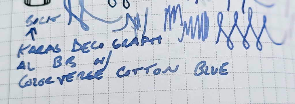 I recently ordered the Decograph rollerball conversion kit to try out as I was using mostly rollerballs at work. I had a blue-black needlepoint energel refill in there now and there’s not much else to say other than it writes great but the tip tends to wiggle. I’ve had this issue with every non-Pentel pen body that I’ve put this refill in though. Previously, I inked the fountain pen nib with Colorverse Cotton Blue and it writes well with a thicc line. This ink is a bit dry, and Bock nibs tend to be dry, so I’ll try an Irohizuku ink for potentially better results.
