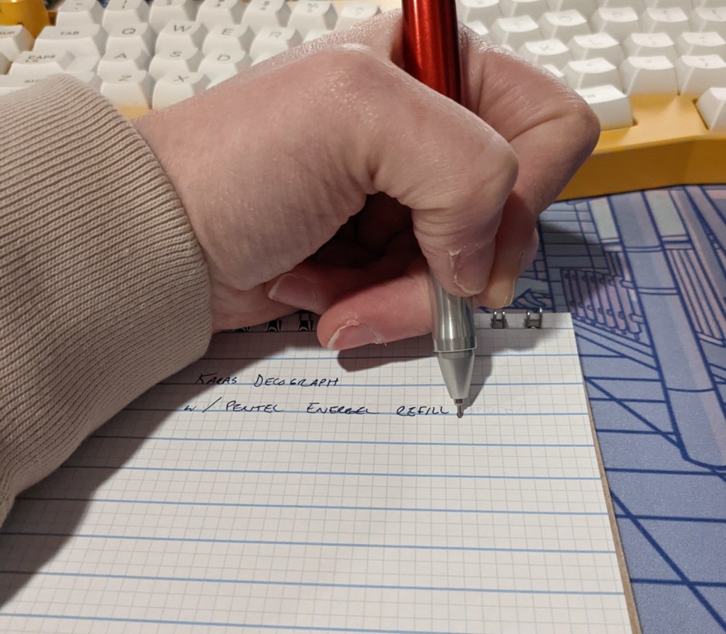 One issue that I tend to have with metal pens that have threaded caps is that the threads can be sharp and uncomfortable. For example, the Kaweco AL Sport is uncomfortable to write with for more than one sentence because it has a short grip section with about 3 millimeters of sharp threads. My grip usually falls a bit high on most small to medium sized pens, so factors like threading and body-to-section steps are a consideration for me. The Decograph has flat threads (about 6 mm long), a minimal step, and a long (21 mm) grip section. All of the edges on this pen have a slight chamfer, which is incredibly pleasing. The inside of the cap has an inner cap piece and a wide o-ring so that it stays closed and sealed in your pocket. The o-ring also cushions the cap when closing it, but gets all twisted when I’ve tried posting. The weight of the body itself is just right though, so I haven’t felt the need to post.