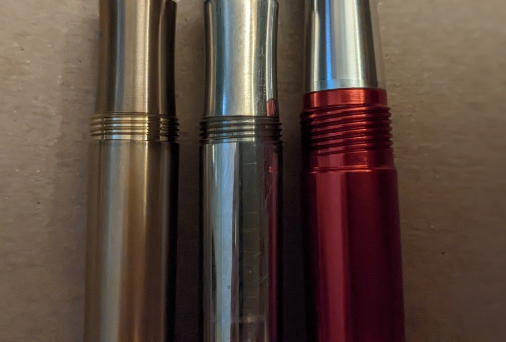 The Decograph is normally made with an acrylic body and machined aluminum trimmings, but earlier in the year they released an all aluminum production version, which is what I have. My Decograph has a body of red anodized aluminum and silver trim with a double broad Bock nib.