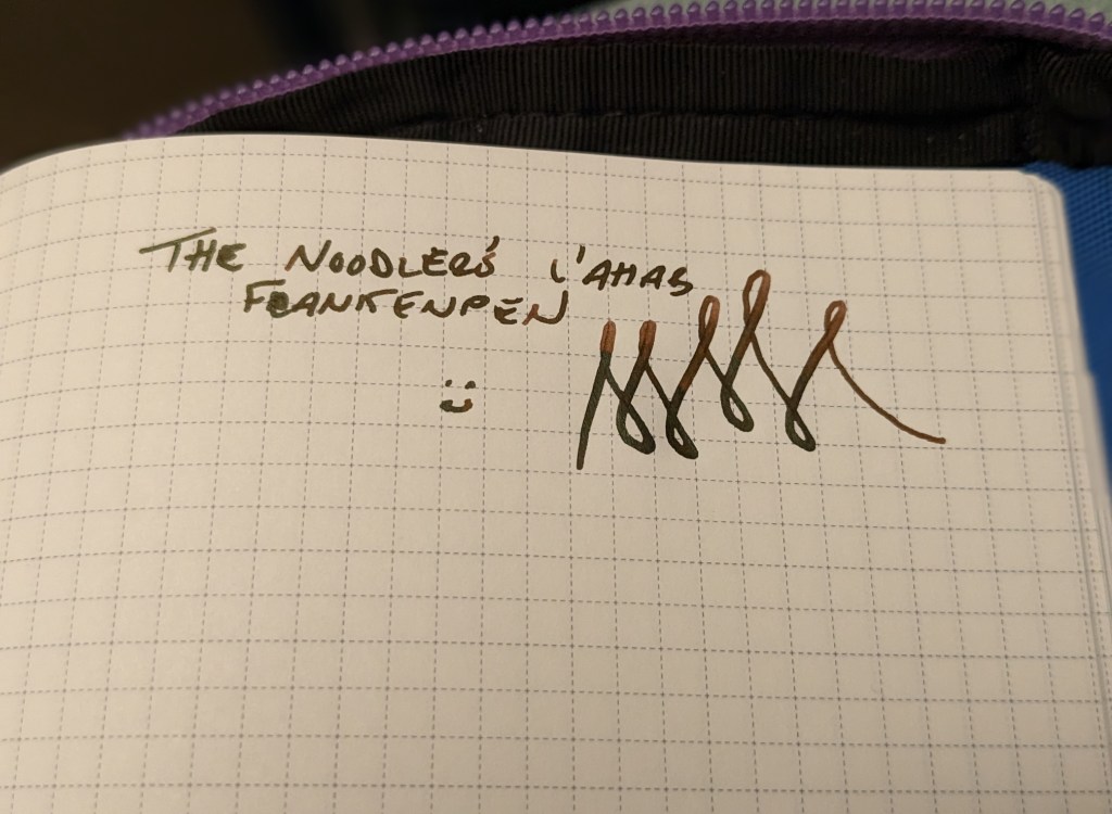 It’s Saturday the 14th, and on this special day I would like to present a cursed frankenpen that I’ve named the L’Ahab. It’s a Noodler’s Ahab with a Lamy Safari nib and feed. The Ahab is a flex pen with an ebonite feed and Noodler’s stock flex nib. The body and cap of the pen is made of vegetal resin that smells pungently earthy, to put it nicely. Since ebonite feeds can be heat set as needed, and since the grip section is able to take a wide variety of nibs, the Ahab is a good model for creating your own Frankenstein’s monster of a fountain pen.