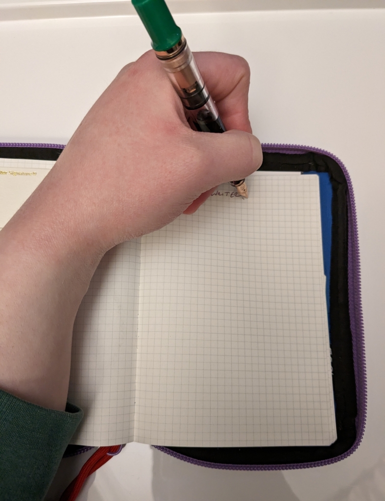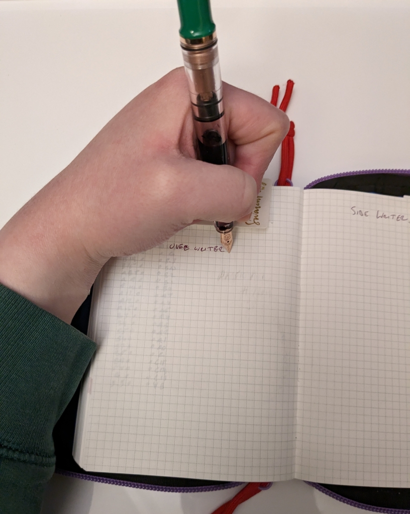 If you’re a side-writer, you write with your wrist straight so that you’re positioned perpendicular to your handwriting. While this handwriting style is perhaps the most comfortable for your wrist, smudging is definitely an issue. Side-writers are also more likely to hold their pen at a higher angle, but the nib would be sideways unless you rotate the pen about 90 degrees so that it’s upside down and at angle. I don’t know much about the physics of side-writing, but it’s likely that you would need a nib that can write at any position and angle.