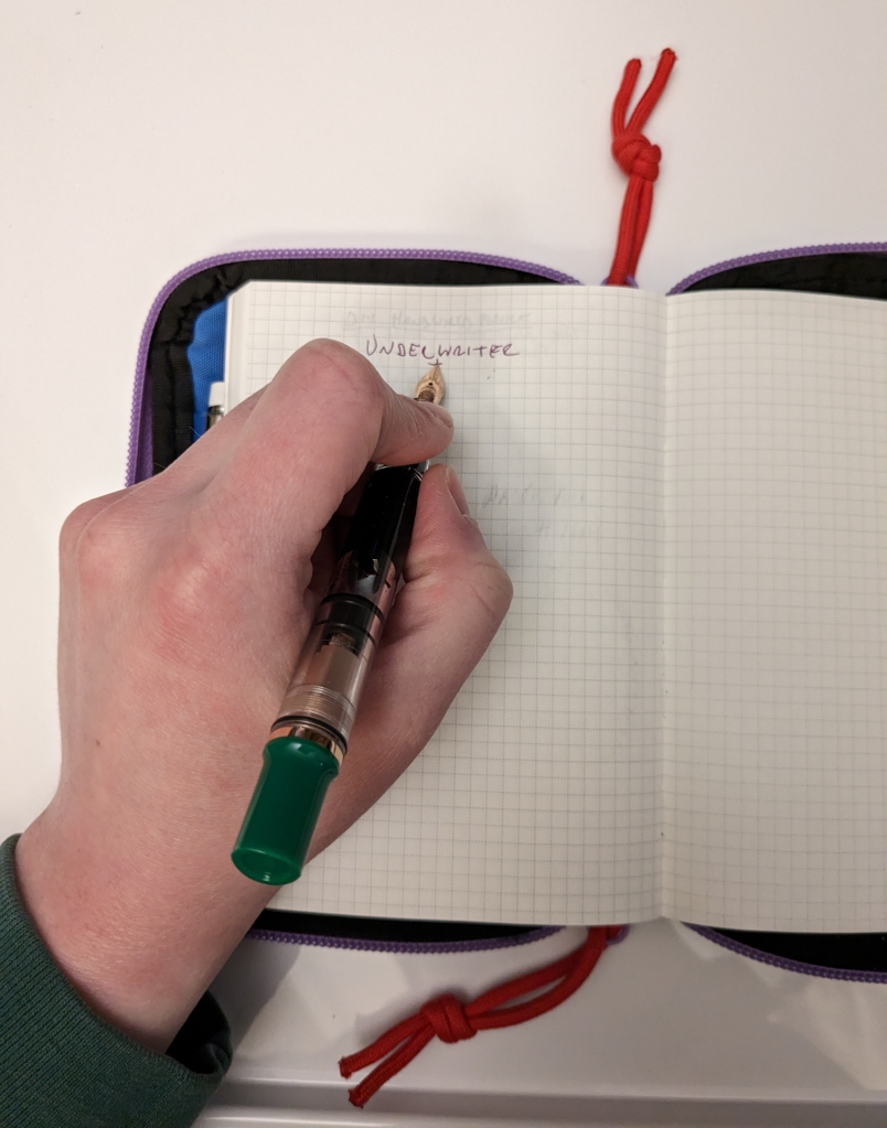 If you’re an underwriter, you can use pretty much any pen you want! You can even use a three-ring binder. You will have an easier time using fun flex and stub nibs. Underwriters are more likely to write at a lower angle, have their hand positioned below their writing, and therefore are using the pen at a more ideal position akin to way the manufacturer intended. They’re still pushing the pen though, so there are still factors to take into consideration like nib smoothness.