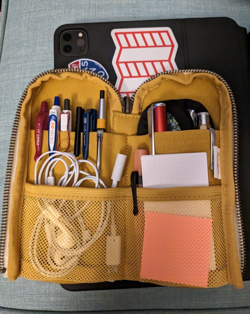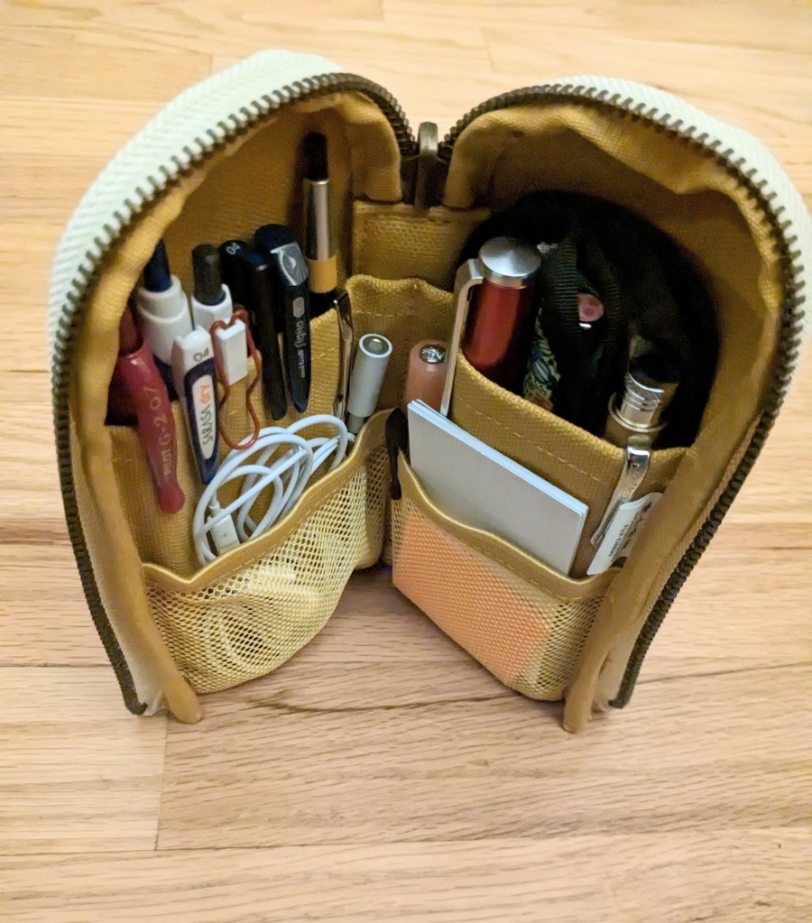 This case has a tall canvas pocket and a short mesh pocker on either side, and a stiff panel in the middle to help it stand up. The zipper is metal and works smoothly. Despite the slim nature of this pouch, it can hold a lot of shit. Right now in mine I have 11 pens, 1 mechanical pencil, 1 Kaweco Sketch-Up, earbuds, a USB-C adapter for the earbuds, a small stack of 7 Nock Co petite note cards, and post-its. This case is tall enough to hold an apple pencil, most regular pencils, but no Blackwings unless they’re sharpened down quite a bit.