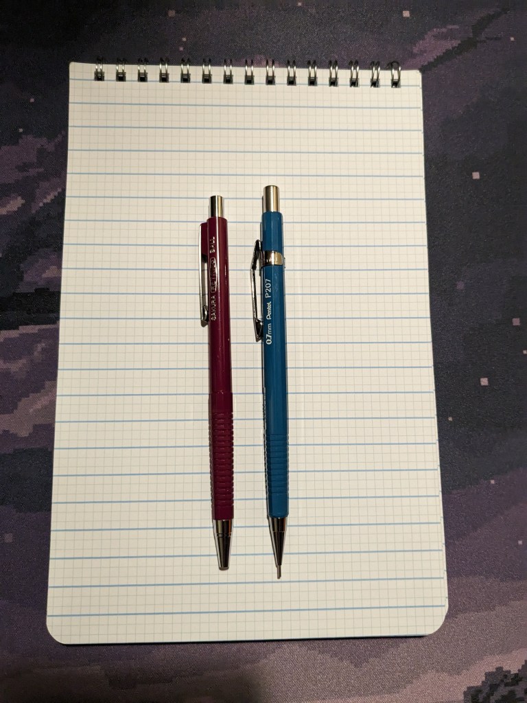 For real though, the Sakura Retrico Ballpoint looks a lot like a Pentel P205 mechanical pencil. They both have similarly geometrically ribbed grip sections, and they both have similarly tactile click mechanisms. The P205 is longer though, the grip section has more of a taper, the entire body is faceted, and the clip is different. That’s it for the P205, you’ll see her again soon.